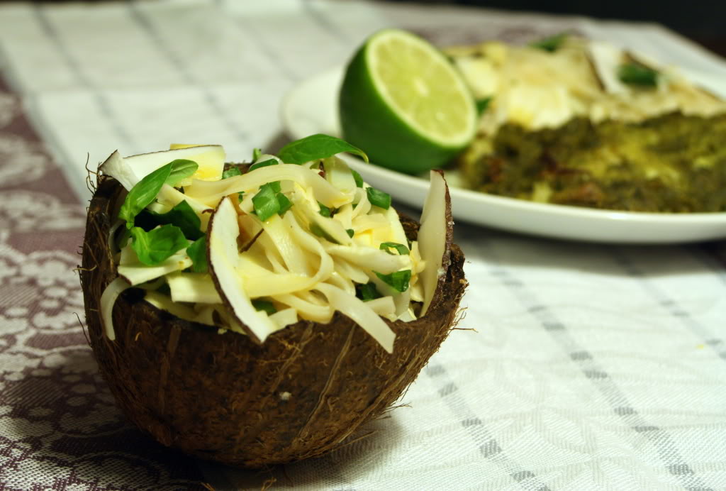 In sfasit, pentru salata, am turnat apa fiarta peste taiteii de orez si i-am lasat 5 minute sa se inmoaie. Apoi i-am clatit cu apa rece si i-am pus intr-un bol impreuna cu dressing-ul. Am adaugat busuiocul, ceapa verde taiata marunt si nuca de cocos si am amestecat bine.