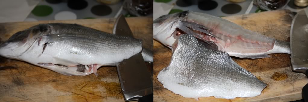 Apoi am curatat si filetat dorada. E o operatiune destul de simpla, daca aveti un cutit ascutit. Am pus pestele pe un tocator si am facut o taietura in spatele capului pana am ajuns la oase. Am facut o alta taiatura la coada si de acolo, am inceput sa tai spre cap, sprijinind cutitul de coloana. Cand am ajuns la taietura, am separat fileul. La fel am facut si pe partea cealalta a doradei.