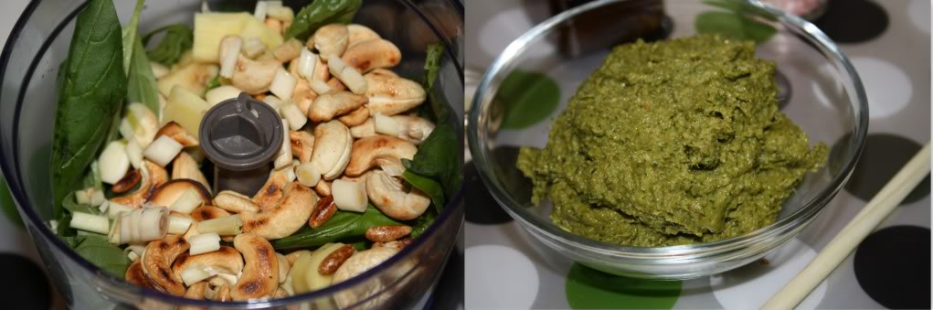 Mai intai am pregatit pesto-ul si am prajit caju-ul impreuna cu semintele de pin (fara ulei) timp de 5 minute, pana cand s-au rumenit. Le-am macinat  apoi intr-un robot si le-am transferat intr-un blender, impreuna cu restul ingredientelor pentru pesto, pentru a le transforma intr-o pasta groasa si aromata.