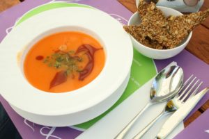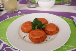 Din meniul destul de variat am ales o supa crema de morcovi, chipsuri de seminte, pizza, sarmale cu smantana de caju, tort cu levantica, smoothie cu patrunjel si kiwi si un fresh de portocale.