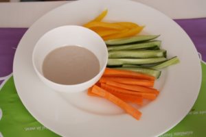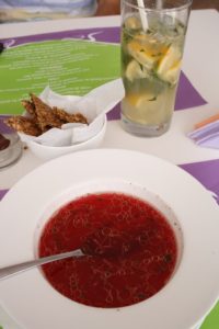 Am luat o ciorba de sfecla (cu bors), din nou chipsuri din seminte, chiftele de nuci marinate cu sos de rosii, pesto de masline si caju cu bastonase de legume, tort de fructe (cu capsuni) si prajitura cu morcovi si mere.