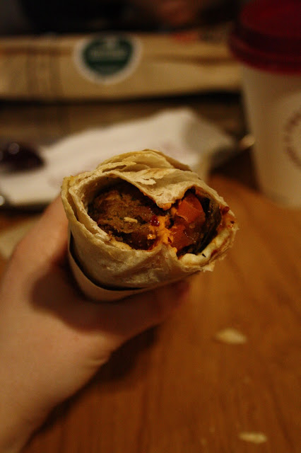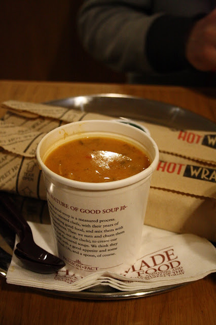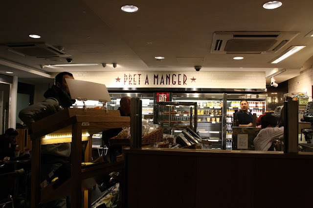 Lihniti de foame, ne-am oprit la Pret a manger-ul de vis-à-vis si am mancat un delicios wrap cu halloumi si harissa (aprox. 4 lire) si o supa cu pui si curry. Pret-ul este restaurantul de tip fast food sanatos, cel mai intalnit in Londra. Oriunde te-ai duce, n-ai cum sa-l ratezi. Uneori, pe aceeasi straduta, gasesti doua. In principal, mancarea lor e promovata ca fiind sanatoasa, fara aditivi si conservanti. Nu pot garanta pentru asta (mai ales ca mi-am luat o limonada care era 100% sare de lamaie), insa pot sa va spun ca mancarea pe care am mancat-o acolo (cam de vreo 3-4 ori) parea mereu proaspata, era gustoasa, iar gama de produse e foarte larga si inedita pentru un “fast food”. Adica am mancat o salata cu cray fish si avocado delicioasa, o supa minestrone si niste sandvisuri vegetariene foarte bune. Nici preturile nu sunt foarte mari, fara de alte locuri, de exemplu, supa miso este 1 lira :).