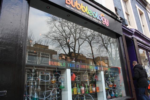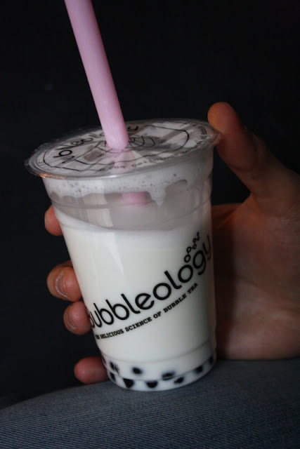 Ne-am oprit la Bubbleology, un local tare simpatic unde se pregatesc bauturi cu “bule”. De fapt, bulele sunt niste boabe de tapioca cu diverse arome. Baza bauturii e din ceai sau lapte, la care se adauga indulcitori si arome (cam artificiale, ce-i drept) si apoi se adauga perlele de tapioca, pe care le tragi printr-un pai foarte gros si le spargi intre dinti :).