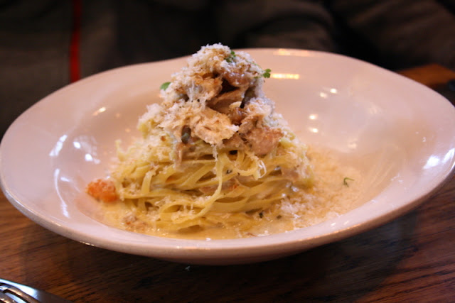 La Jamie’s Italian am facut rezervare pe site, unde am verificat dinainte si meniul. Mancarurile se serveau in doua cantitati, de aperitiv si de fel principal. Pentru ca nu m-am putut decide, am ales doua portii mici, una cu risotto cu carne de crab si una de spaghetti cu cerneala de sepie si scoici St. Jaques. Mi-au placut mi-au placut mai mult pastele pentru ca erau foarte bine condimentate, iar usturoiul era exact cat trebuia ca sa faca pastele autentice. Risotto-ul nu m-a impresionat prea tare si chiar in comparatie cu cel pe care il fac eu, era destul de fad. Ironic, din moment ce reteta pe care o fac eu e de-a lui Jamie :).