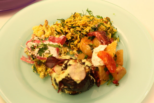 Salatele au fost cu totul altfel decat obisnuitele combinatii de legume proaspete. Am ales niste vinete la cuptor cu sos de iaurt cu menta, o salata din trei feluri de orez si cardamom, salata de sfacla galbena si portocale rosii si o salata de conopida. Din farfuria cu patru sortimente am mancat doua persoane si chiar ne-am saturat.