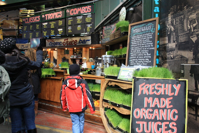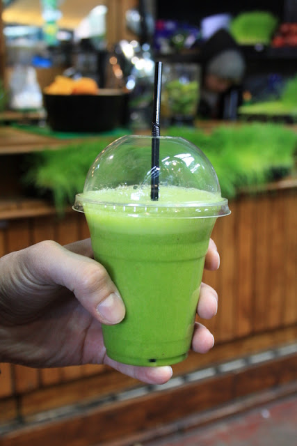 Am descoperit si o taraba cu sucuri natural in combinatii originale si cu multe ingredient sanatoase (iarba de grau, ghimbir, acai) de unde am luat un smoothie de banana, mere si iarba de grau foarte bun dar cam scumput (4 lire).