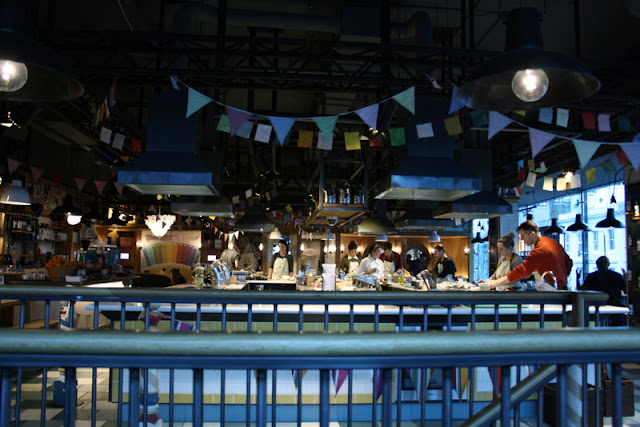 La intoarcere, ne-am oprit la Recipease din Notting Hill, un alt local al lui Jamie, cu doua etaje, unde se poate manca, se pot cumpara produsele lui si chiar se tin cursuri de gatit. Ce mi-a placut cel mai mult, era blatul de lucru din mijlocul fiecarui etaj, asezat intr-un dreptunghi, la care se asezau “ucenicii” si unde gateau ce li se indica la curs. Cat am stat acolo chiar am prins in actiune cateva cupluri care dupa ce au gatit, s-au asezat la o masuta si s-au bucurat de rezultatul muncii lor :).
