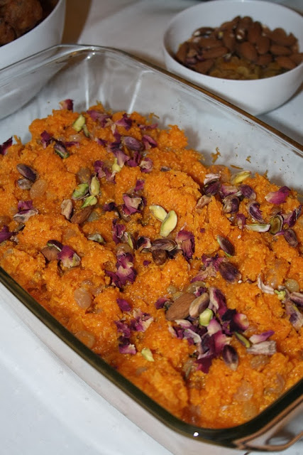 Gajjar ka halwa (morcovi rasi fierti in lapte, cu stafide, migdale, fistic si petale de trandafiri)