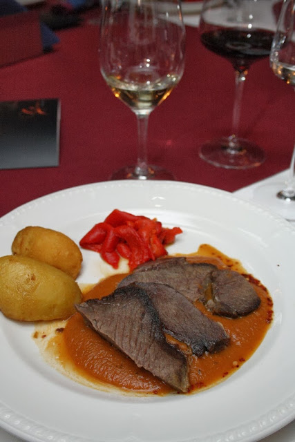 Am inceput cu un mousse orange (somon, branza de capra, arpagic), mini tarte (icre, lamaie verde) si transa de vitel cu jeleu din vin rosu cu jardin delice  (legume tinere, smantana, sos béchamel). Pentru ca nu stiam ce urmeaza, am mancat tot pentru ca a fost foarte bun. Jeleul de vin a fost chiar deosebit.