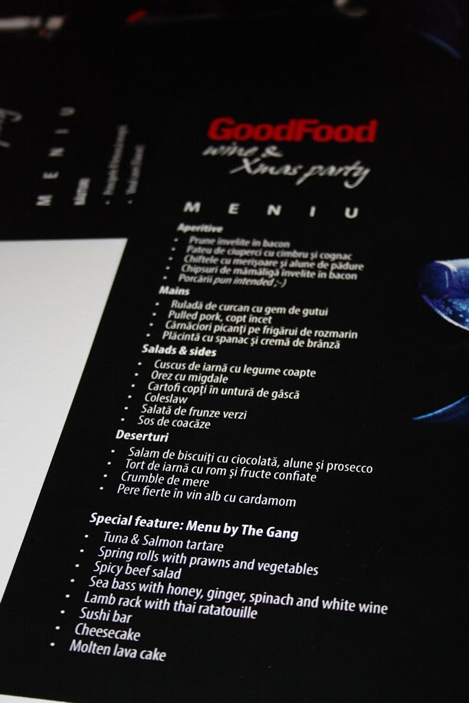 Din fericire, Good Food a organizat si cu ocazia Craciunului, o petrecere exact pe gustul meu. Ne-a adunat la The Gang, ne-a pus muzica frumoasa si ne-a introdus in atmosfera de sarbatori cu un meniu festiv foarte inspirat si o selectie de vinuri, caci a fost, de fapt, Wine & Xmas Party. Din pacate, n-am putut sa ma bucur de ele, pentru ca, am tras batul cel mai scurt si a trebuit sa conduc :). Deci, despre vinuri nu va pot povesti nimic, decat ca am auzit ca ar fi fost foarte bune, mai ales ca au fost pastrate la temperatura optima, in frigidere speciale pentru bauturi, de la Liebherr. Dar despre mancare am multe sa va povestesc :).