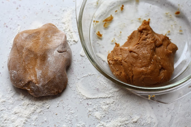 In poza de mai jos, aluatul din vasul de sticla are consistenta initiala, iar in cel de pe blat, am adaugat faina inainte de a intinde foaia. E foarte important ca aluatul sa ramana moale si cald, inainte de a fi intins, pentru a nu se intari prea tare.