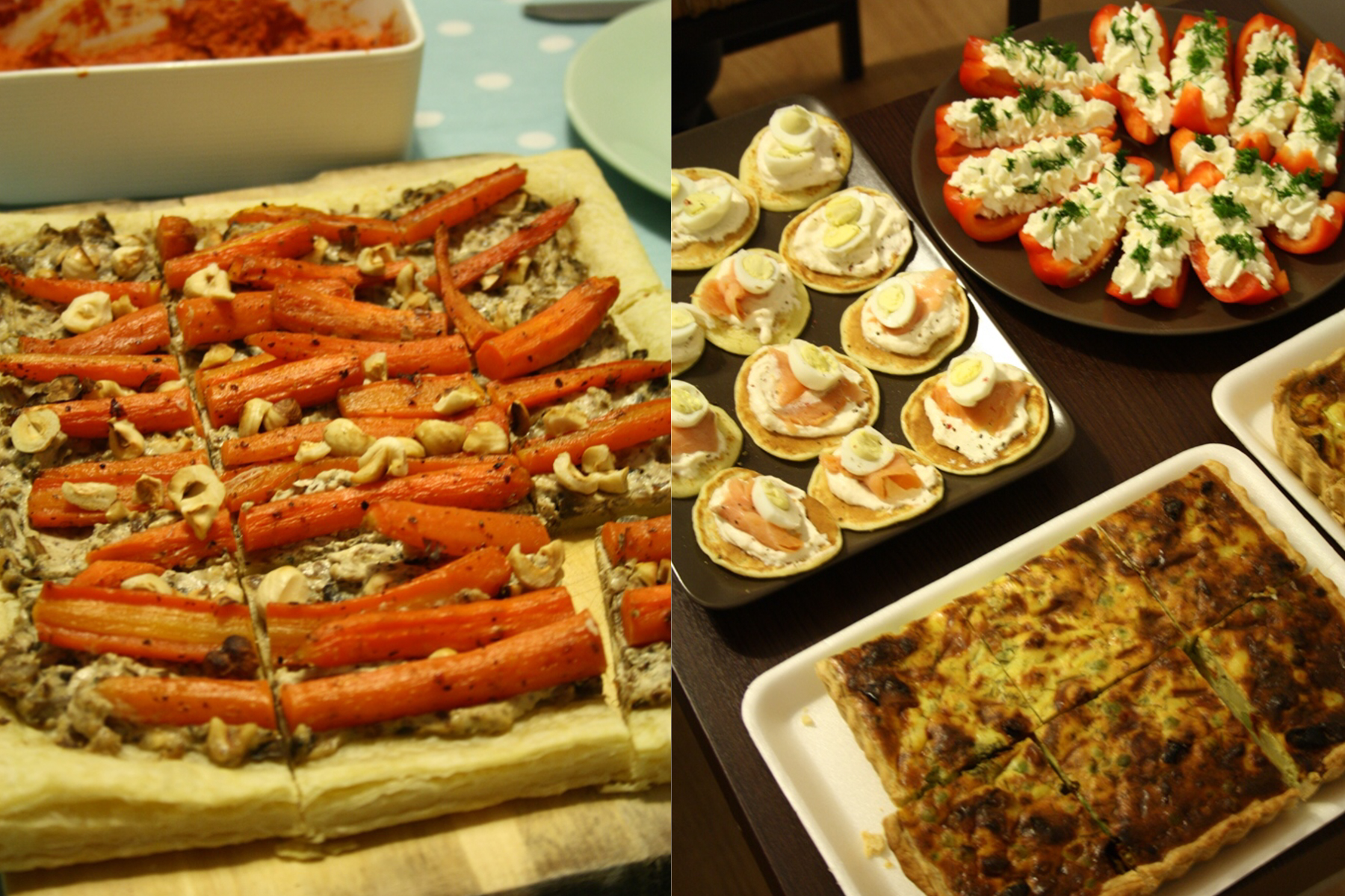 În afara de câteva preparate tradiționale, de Crăciun am avut pe masă blinis cu ricotta, somon și ouă de prepeliță, o tartă cu ciuperci și morcovi caramelizați, ruladă de curcan cu ciuperci și smochine, o salată de dovleac cu năut, cheesecake cu cafea, un cozonac cu nucă minunat și cacao (merci pentru rețetă, Easy Peasy!) și prăjitură cu smântână și nuci, despre care vă voi povesti azi.