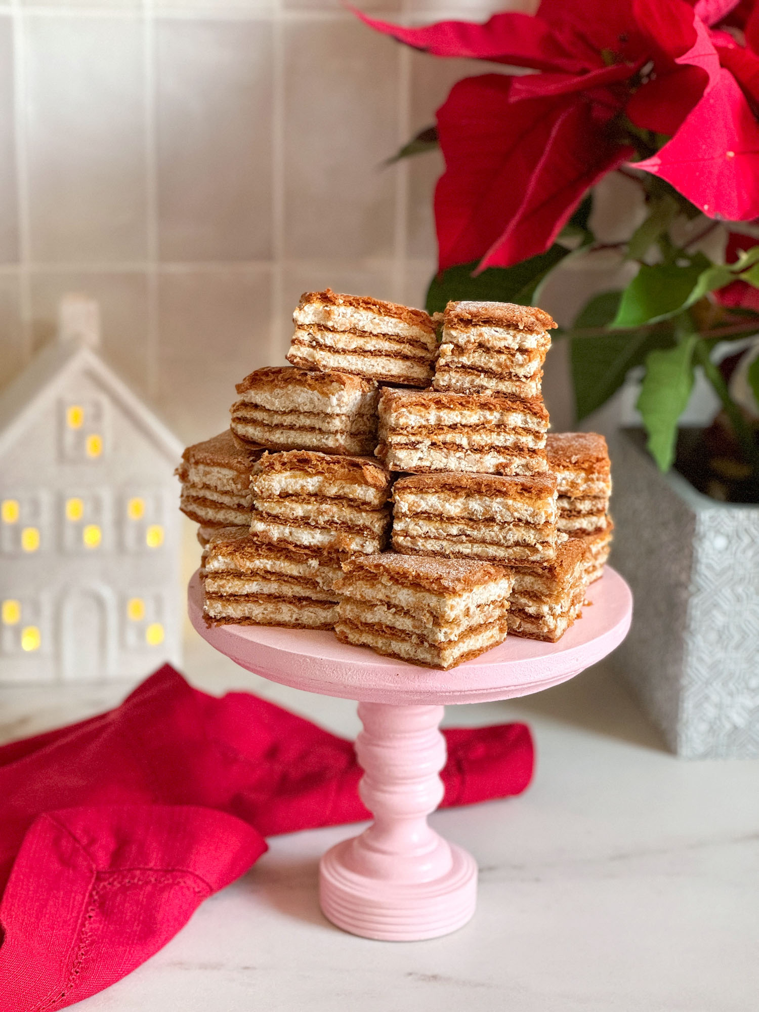12. Se unge prima foarte cu cantitatea de cremă corespunzătoare, și se repetă pașii cu restul de foi și de cremă. Eu aleg să așez deasupra foaia cea mai netedă, că prăjitura să aibă un aspect îngrijit.