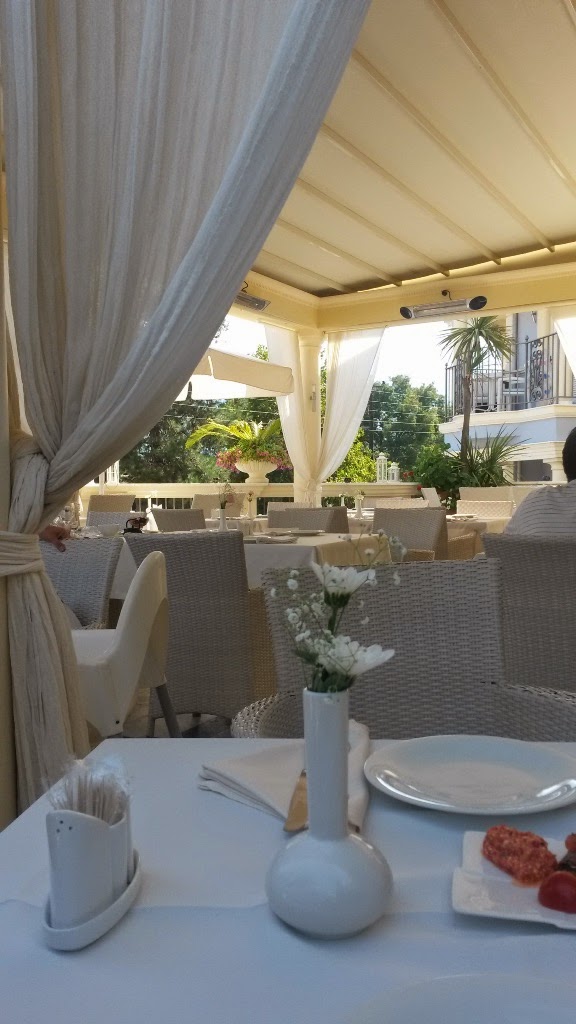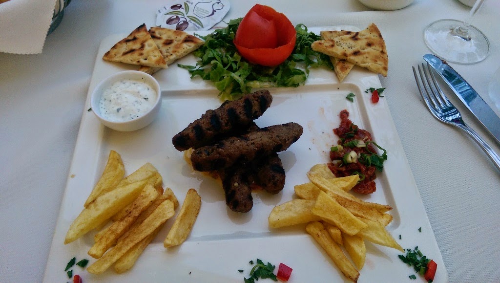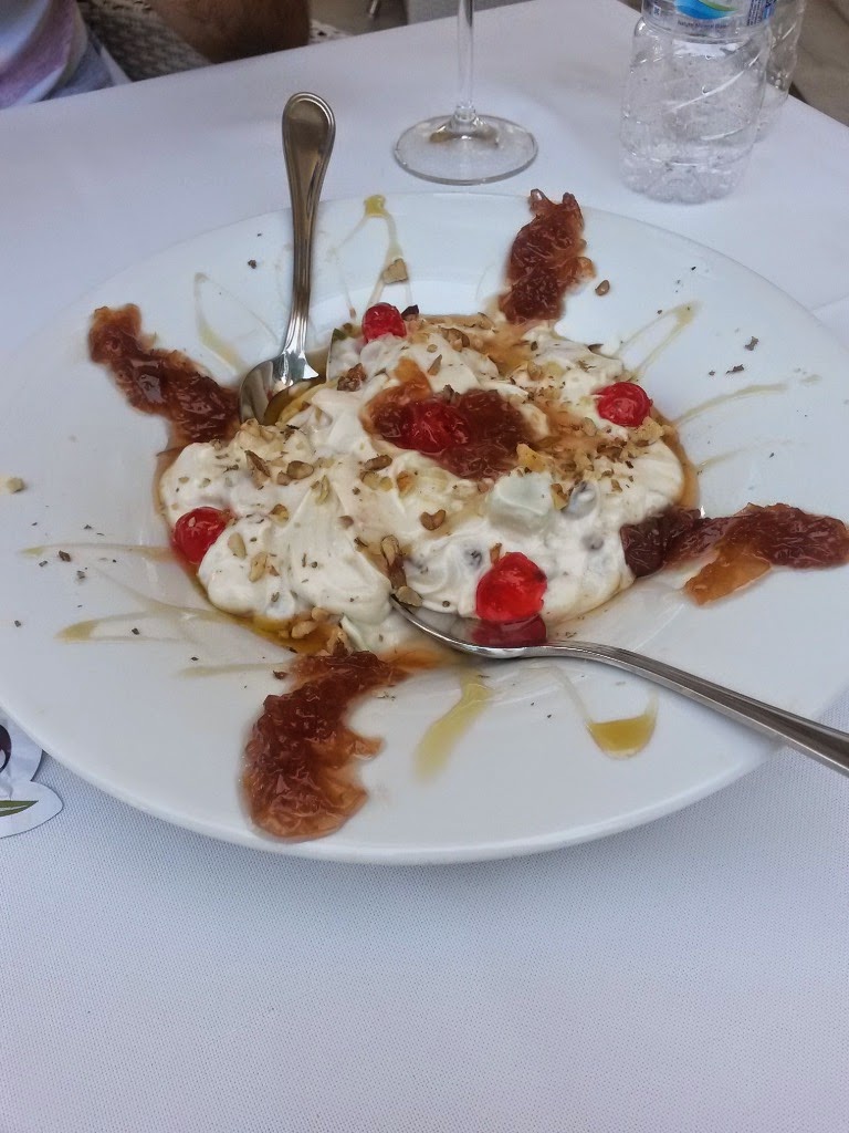 Ce nu mi-a placut a fost limonada, pe care desi am cerut-o neindulcita (cu precizari clare “just lemon juice and water”), a venit mega dulce si era clar facuta din concentrat de lamaie. Am refuzat-o si am luat o apa. Limonada greceasca e inca un lucru care nu-si merita banii, am incercat si pe plaja sa cer una neindulcita si a venit de doua ori la fel de dulce, n-am mai trimis-o a doua oara inapoi, dar nici n-am baut-o. Cat despre servire, incepusa promitator, cu un tip amabil si zambitor, care ulterior a disparut si a trebuit sa asteptam vreo 20 de minute desertul, dupa ce le-am reamintit de el. De cel din partea casei au uitat, desi la alte mese il adusesera. Oricum, eram indulciti peste masura, dar nu pot spune ca au avut prea mare grija de noi.