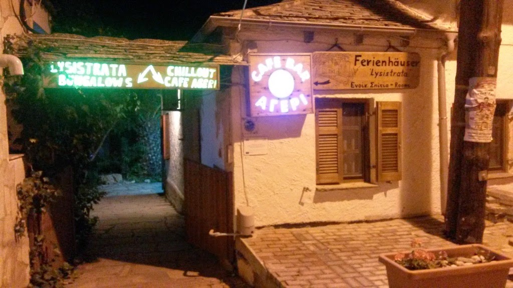 Aici nu am apucat sa mancam, insa am descoperit o terasa foarte frumoasa si linistita, pe malul marii. Se numeste Ageri din cadrul complexului Lysistrata si ne-a placut tare mult atmosfera. Au niste scaune foarte comode, care seamana cu niste sezlonguri, care sunt asezate cu fata la mare. Muzica foarte buna si relaxanta, si in fata ta, stelele si marea :). Am stat acolo vreo ora fara sa vorbim prea mult, doar ne-am relaxat si am iesit din haosul de pe strazile Potos-ului.