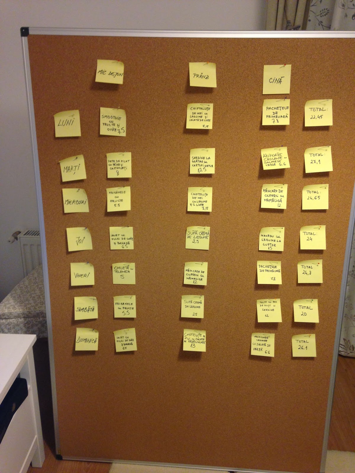 N-am avut foarte mult timp la dispozitie sa caut cele mai bune preturi sau sa testez toate retetele din ce pusesem pe lista pentru meniuri, dar am incercat sa estimez gramajul fiecarei portii, sa identific anumite alimente mai ieftine si sa gasesc niste combinatii diversificate, cat mai sanatoase si echilibrate. Majoritatea sunt retete pe care eu le fac destul de des.