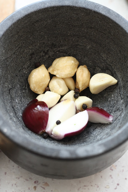 Intr-un mojar se piseaza nucile, usturoiul, piperul, partea alba a cepelor cu sarea si zaharul, pana devin pasta. Aceste nuci (candlenuts) le-am luat din Bali si nu am reusit sa identific numele lor in romana. Sunt foarte asemanatoare cu nucile macadamia, la forma si textura, insa ca gust sunt usor mai amarui, dar le puteti inlocui fara probleme cu macadamia.