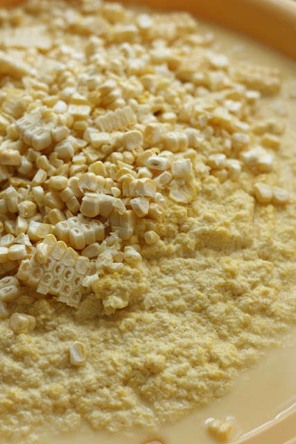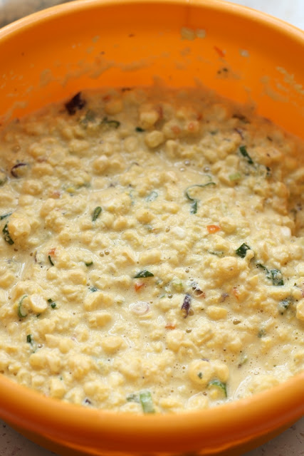 6 stiuleti de porumb se dau prin razatoarea mare. Atentie, ca stropesc peste tot, si va recomand sa purtati un sort de bucatarie. Restul de 4 stiuleti se curata de boabe taindu-le cu un cutit pe verticala. Astfel, veti obtine o pasta destul de lichida de la porumbul ras si boabe intregi de la cel taiat. Se pun impreuna intr-un bol, in care se adauga, ouale si cele doua tipuri de faina.
