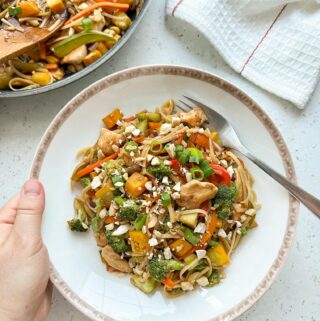 Într-o zi în care nu știam ce să mai gătesc la prânz, dar aveam piept de pui și mai multe legume, am dat peste rețeta asta de stir fry cu pui și legume, am zis că are potențial și o să o încerc. Mi-a plăcut foarte mult rezultatul, așa că am trecut-o pe lista de rețete preferate și am gătit-o de mai multe ori de atunci în diverse combinații de ingrediente. Se pot face și doar cu legume, sau se poate folosi tofu în loc de pui, pentru o rețetă vegană.