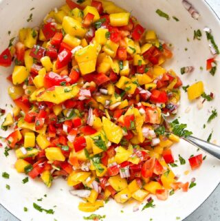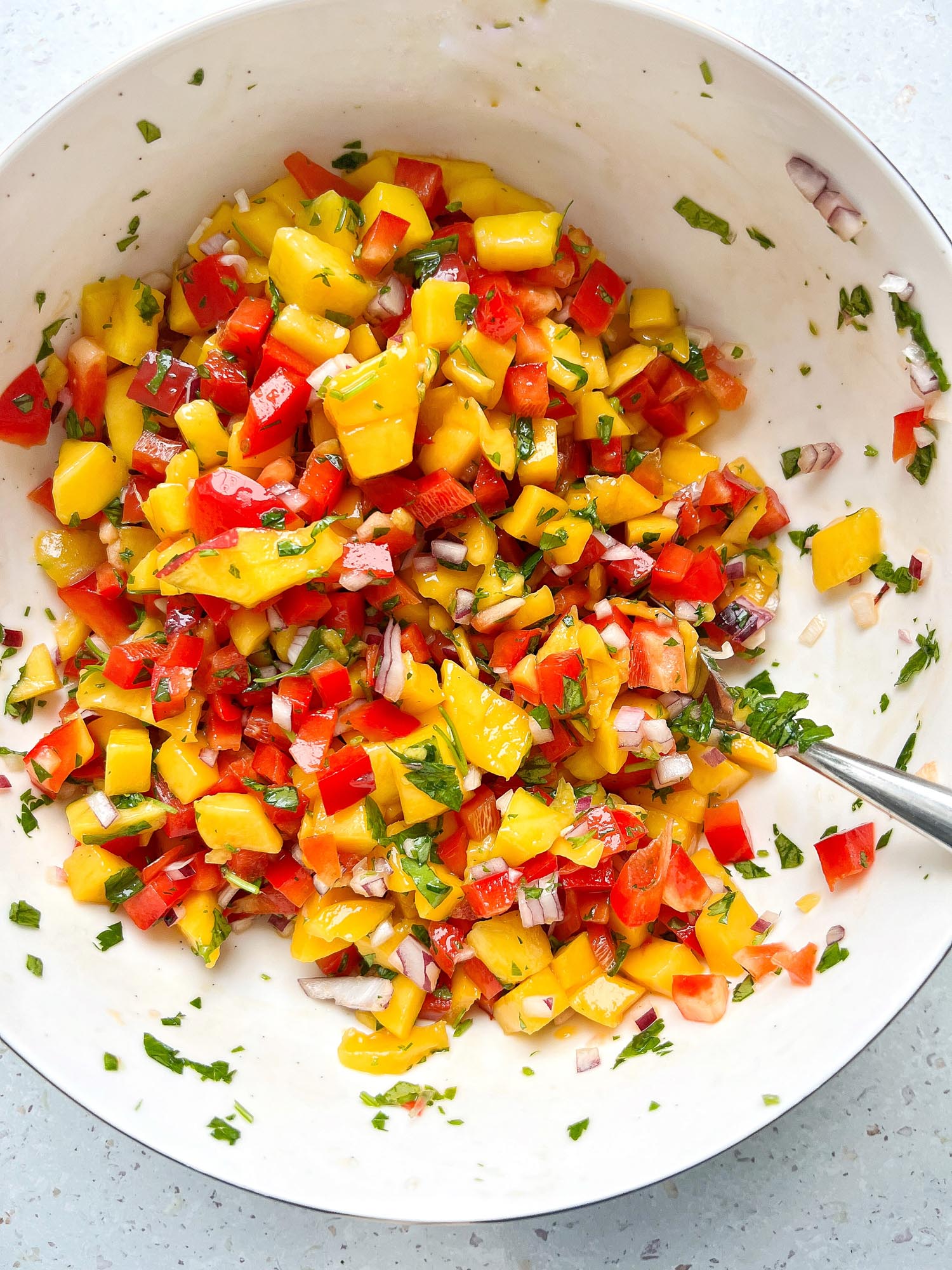 Deși numele te duce cu gândul la un sos, salsa de mango e mai degrabă o salată fresh, dulce acrișoară. Conține mango (e recomandat să folosiți unul bine copt, dar ferm), ardei gras, ceapă, coriandru (sau pătrunjel dacă nu vă place coriandru), zeamă de lime și opțional puteți adăuga un ardei iute sau fulgi de ardei iute. Dacă doriți, puteți adăuga și un avocado pentru mai multă consistență și cremozitate.