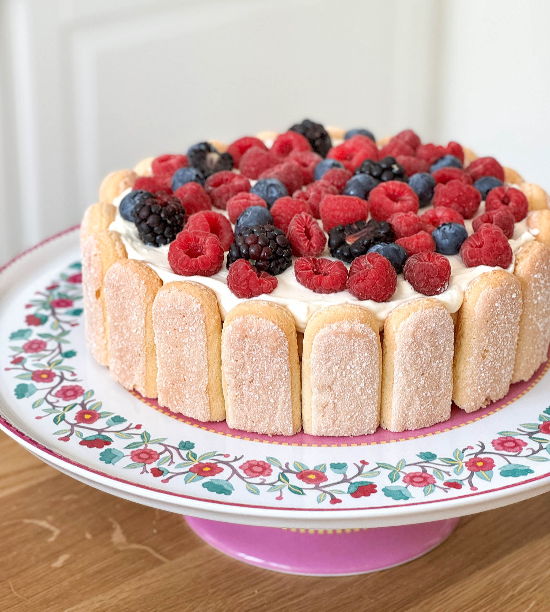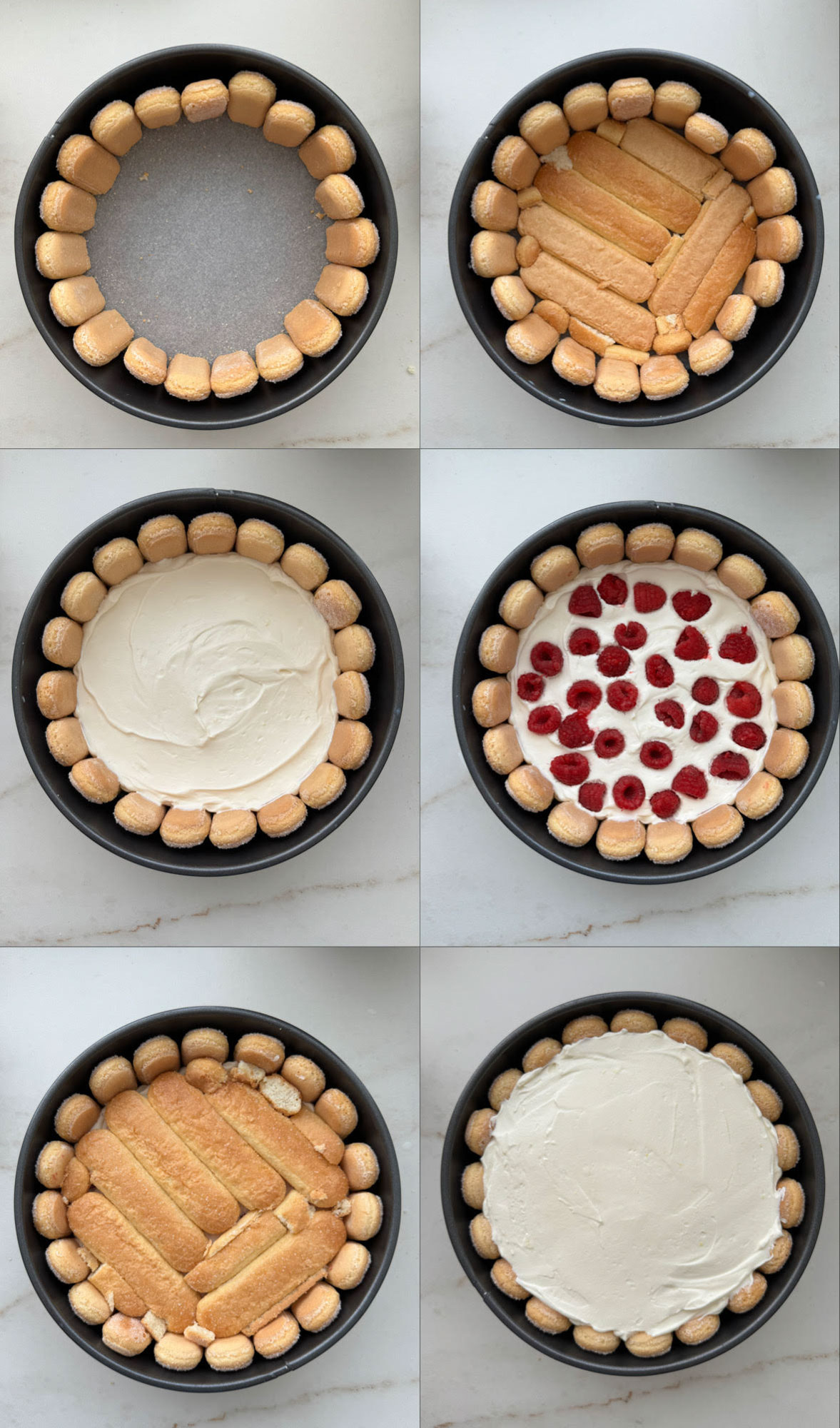 - Se pune un strat subțire de cremă care se întinde și pe pișcoturile care stau in picioare, astfel încât acestea să se fixeze mai bine. Se pun fructele (congelate sau proaspete), se acoperă cu cremă, apoi se așază din nou în strat de pișcoturi înmuiate, cremă, fructe și la final restul de cremă care se nivelează.