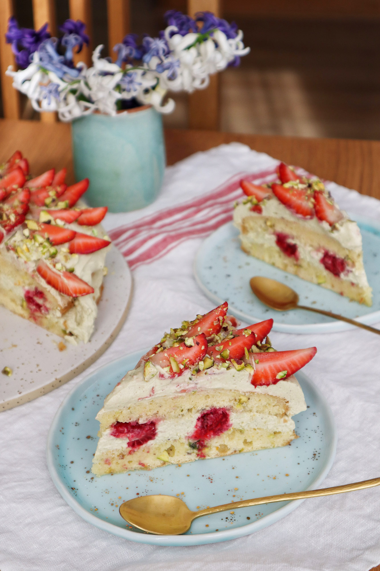 - Când blatul s-a răcit, se taie în 2 straturi. Primul strat se însiropează, se unge cu cremă, iar peste cremă se așază zmeura. Se acoperă cu al doilea strat de blat, se însiropează, apoi se decorează cu restul de cremă, căpșuni și fistic tocat.