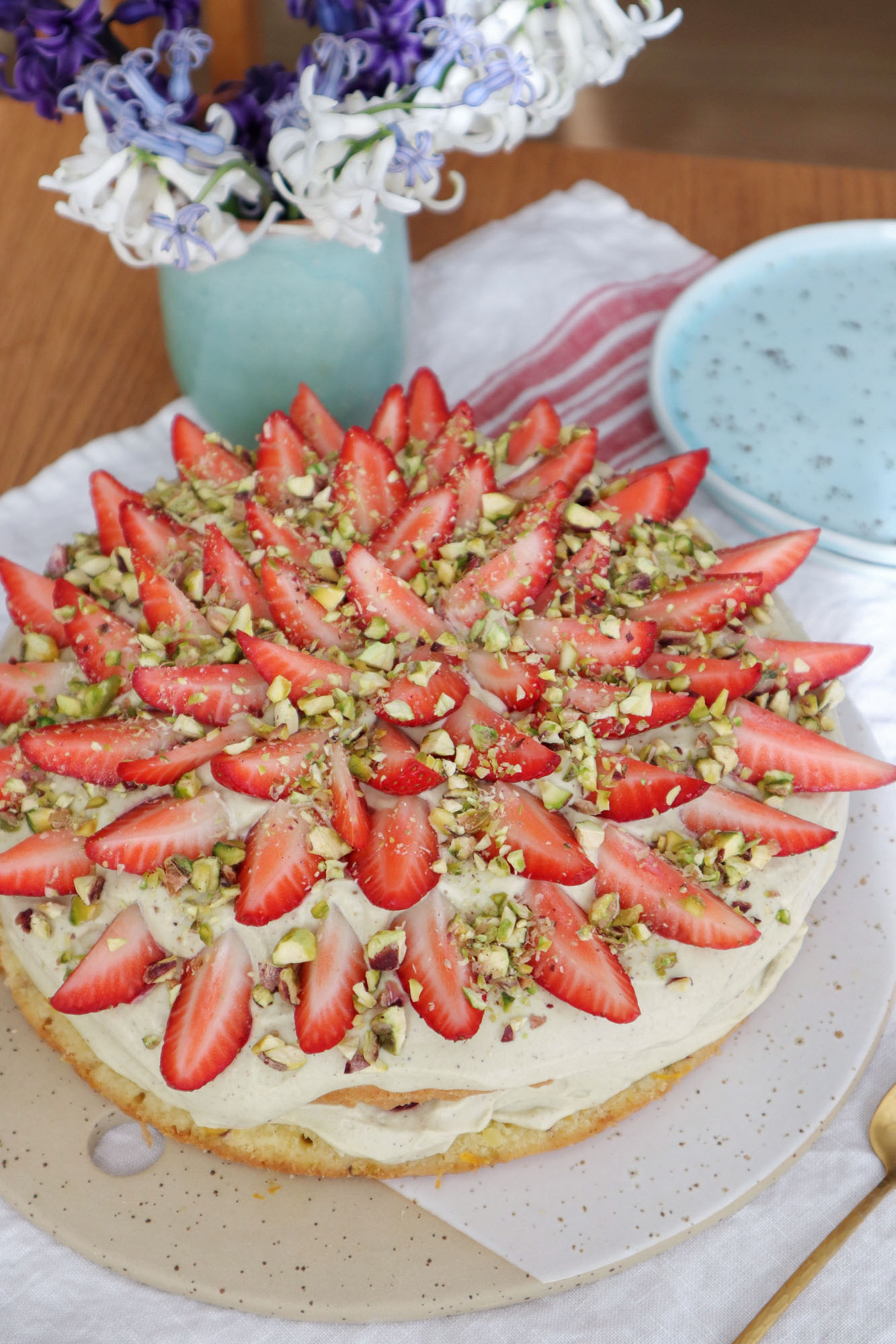 Acest tort de căpșuni cu fistic este acel tip de desert pe care dacă îl faci o dată, vei dori să îl refaci iar și iar. Combinația de căpșuni cu fistic este fantastică, iar blatul pufos, cu bucăți crocante de fistic și cremă fină și proaspătă se completează extrem de bine.